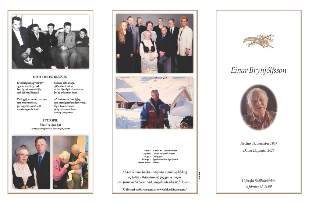 Streymi Streymi frá útför Einars Brynjólfssonar frá Skálholtskirkju 5. febrúar kl. 11. Ath. hljóð og mynd fer í beina útsendingu að lágmarki15. mínútum fyrir athöfn,