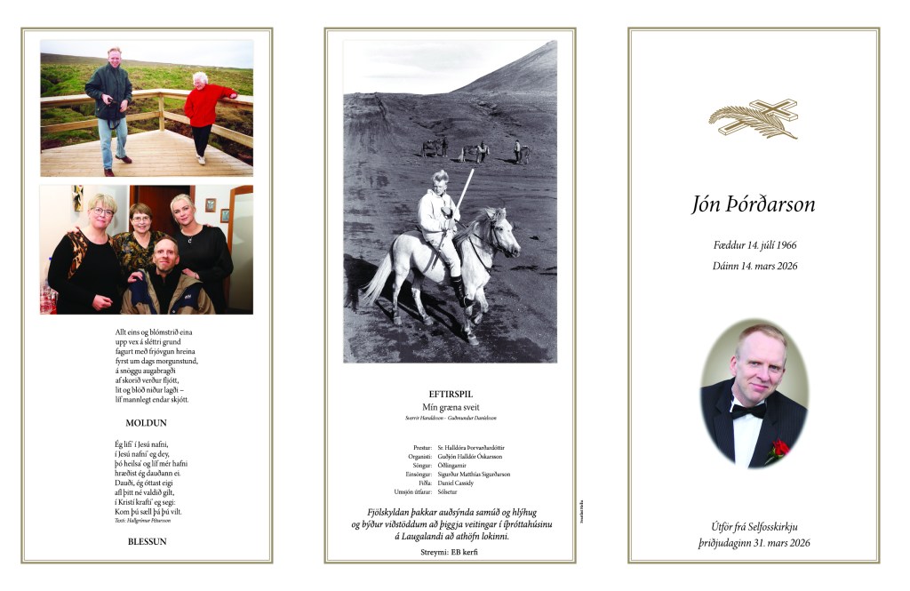 Streymi Streymi frá útför Jóns Þórðarsonar frá Selfosskirkju 31. mars kl. 13. Ath. hljóð og mynd fer í beina útsendingu að lágmarki15. mínútum fyrir athöfn,